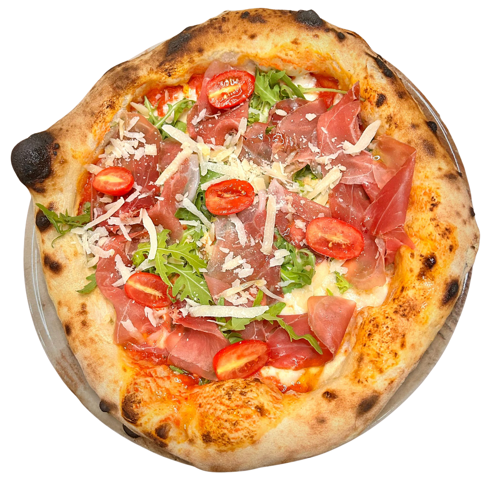 Verfeinert mit mildem Parmaschinken DOP, knackigem Rucola, gereiftem Parmesan-Carpaccio und Piennolo-Kirschtomaten.