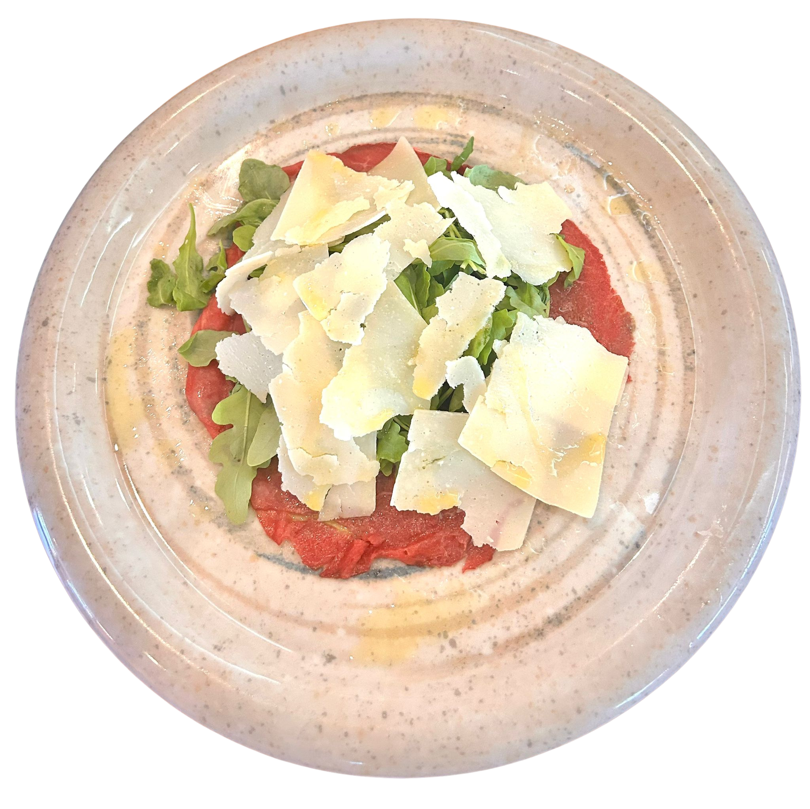 Zartes Carpaccio vom feinen Rinderfilet, hauchdünn geschnitten, auf einem Bett aus frischem Rucola und verfeinert mit gereiften Parmesanspänen. Eine leichte und edle Vorspeise, abgerundet mit einem Schuss nativem Olivenöl extra, um den authentischen Geschmack zu unterstreichen.