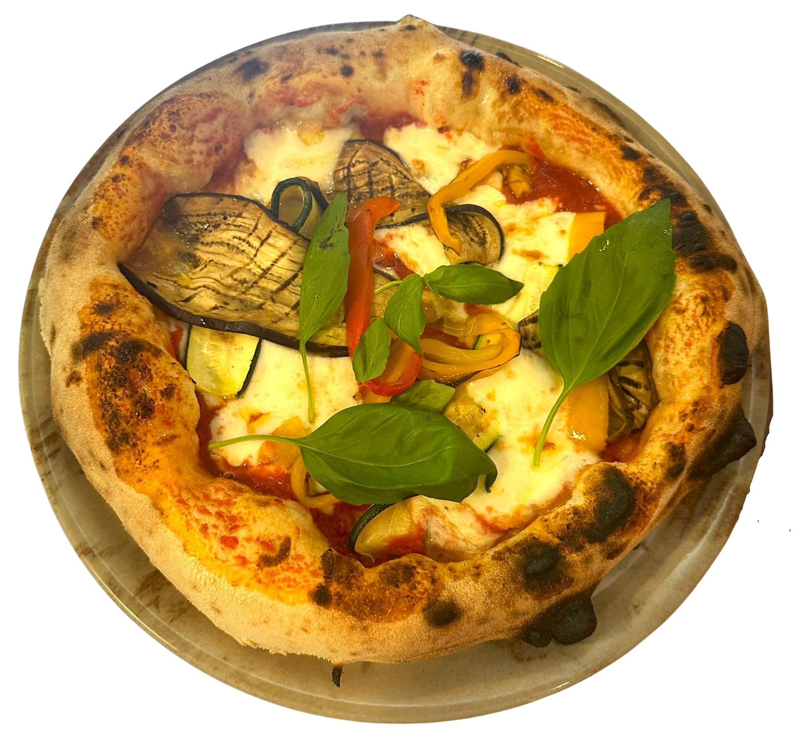 Die Pizza Flegrei ist eine Explosion mediterraner Frische und Aromen: San-Marzano-DOP-Tomaten, zartschmelzender Fiordilatte und gegrilltes saisonales Gemüse. Ein Hauch von Knoblauch und frischem Basilikum rundet diese duftende, leichte Kreation ab. Ideal für alle, die echte und natürliche Geschmäcker lieben.