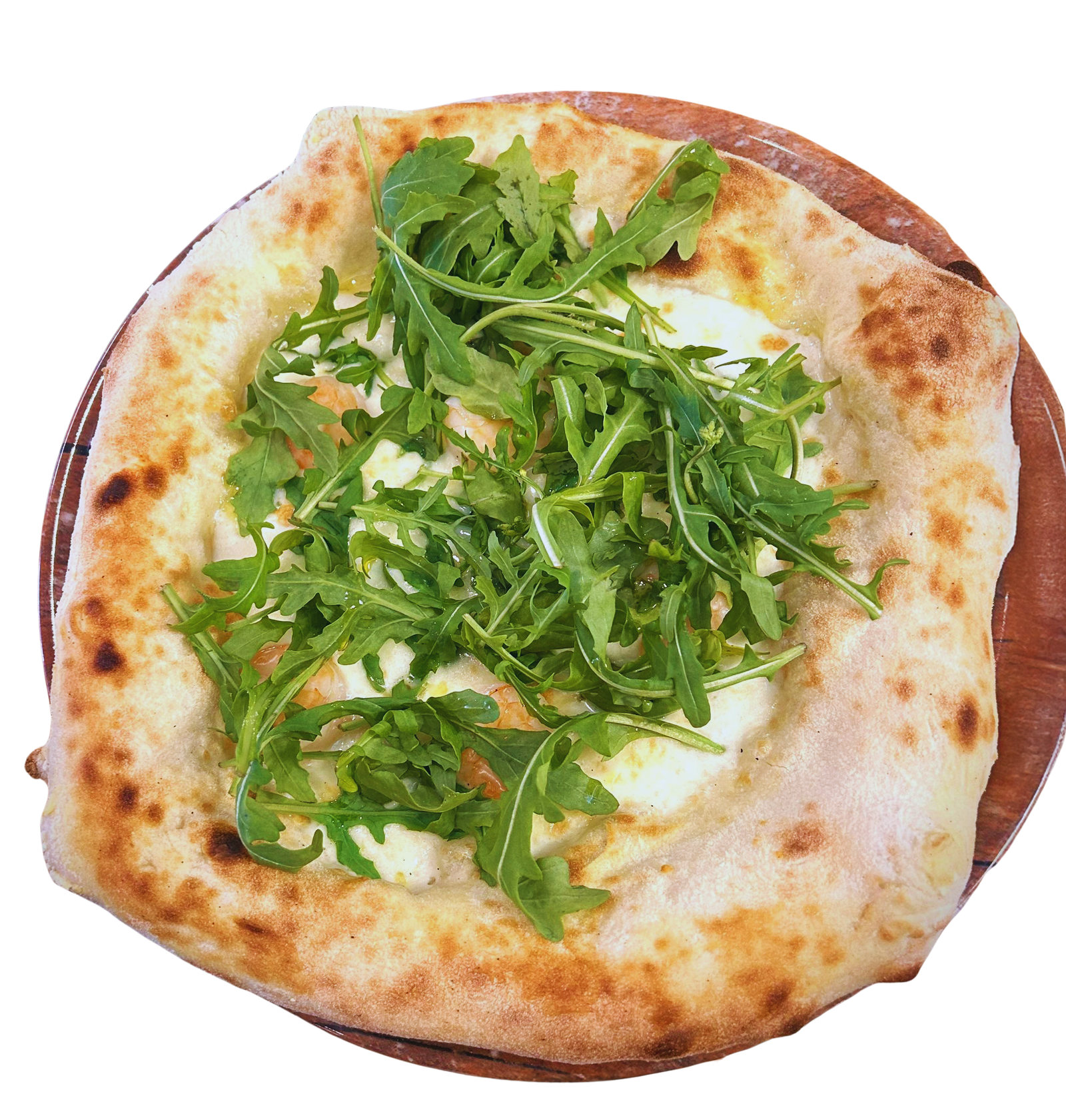 Fiordilatte, Gorgonzola, Italienischer Speck, Garnelen, Rucola