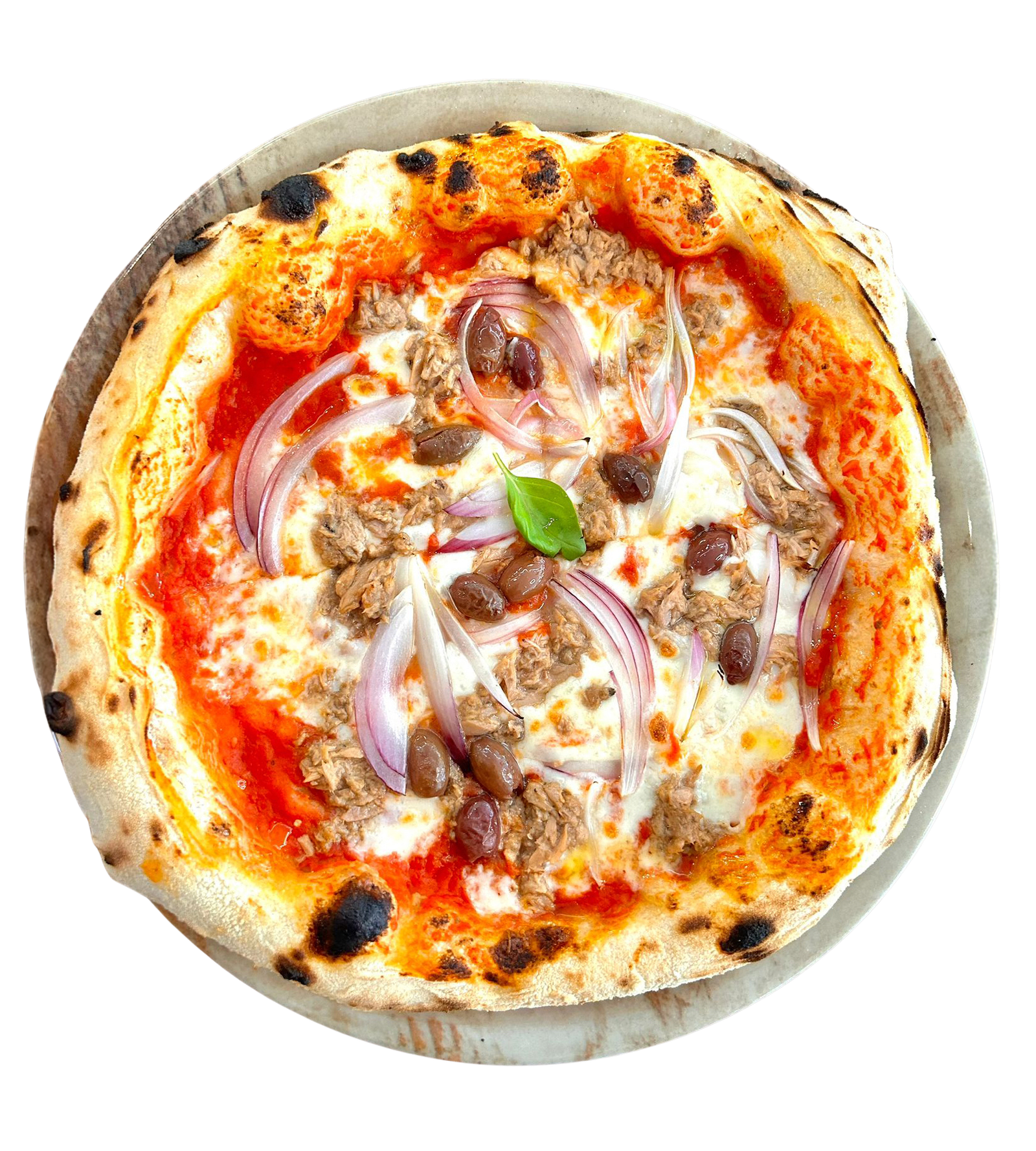 San Marzano, Fiordilatte, Thunfisch, Rote-Zwiebeln, Taggiasca-Oliven
